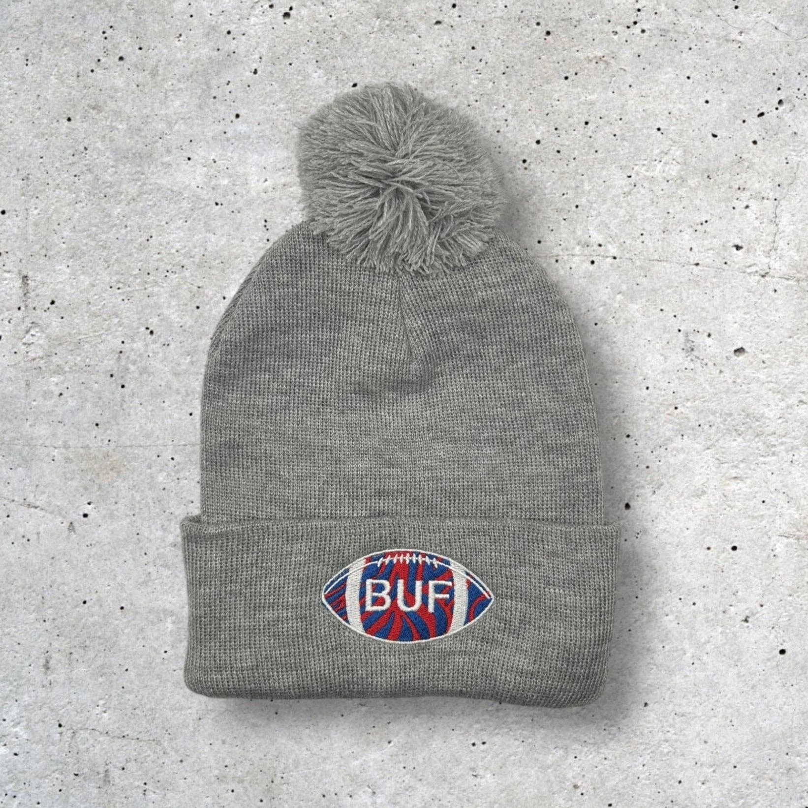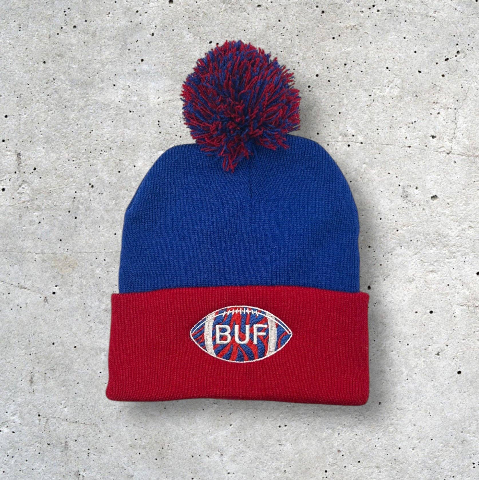 Embroidered BUF Football Beanie: Blue/Red / Pom Beanie
