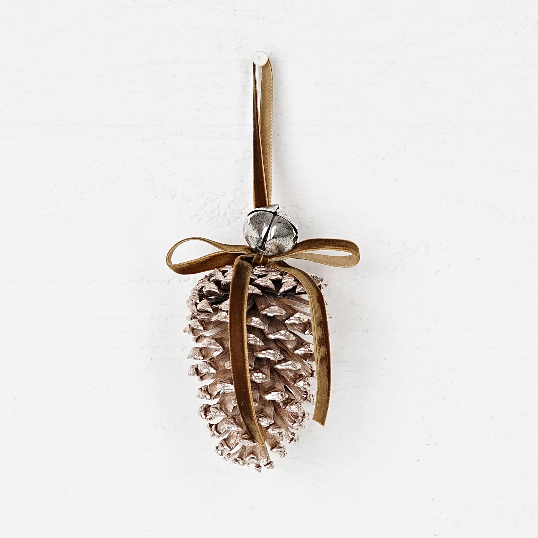 Hanging Jumbo Pinecone with Bell – Champagne (6”)